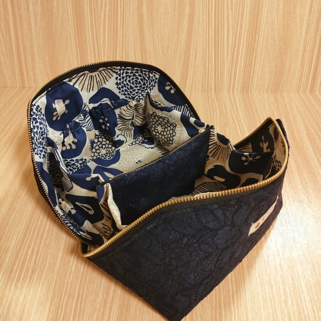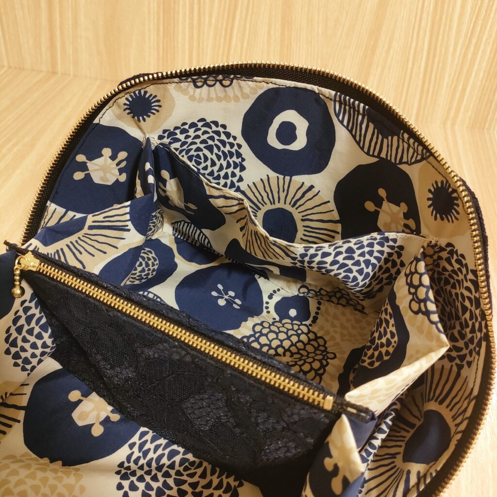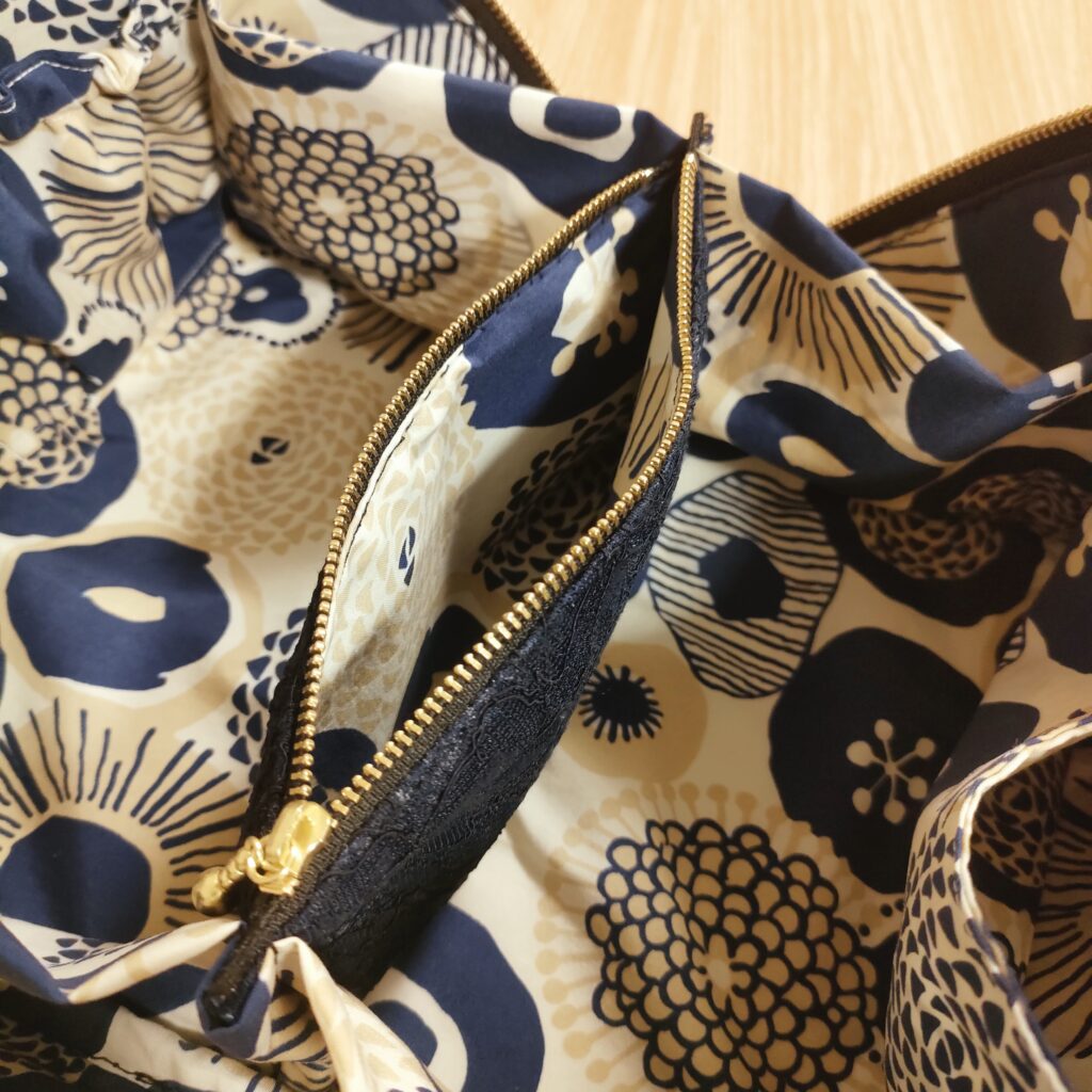 表地には、深みのある紺色の綿生地に繊細な黒レースを重ね、