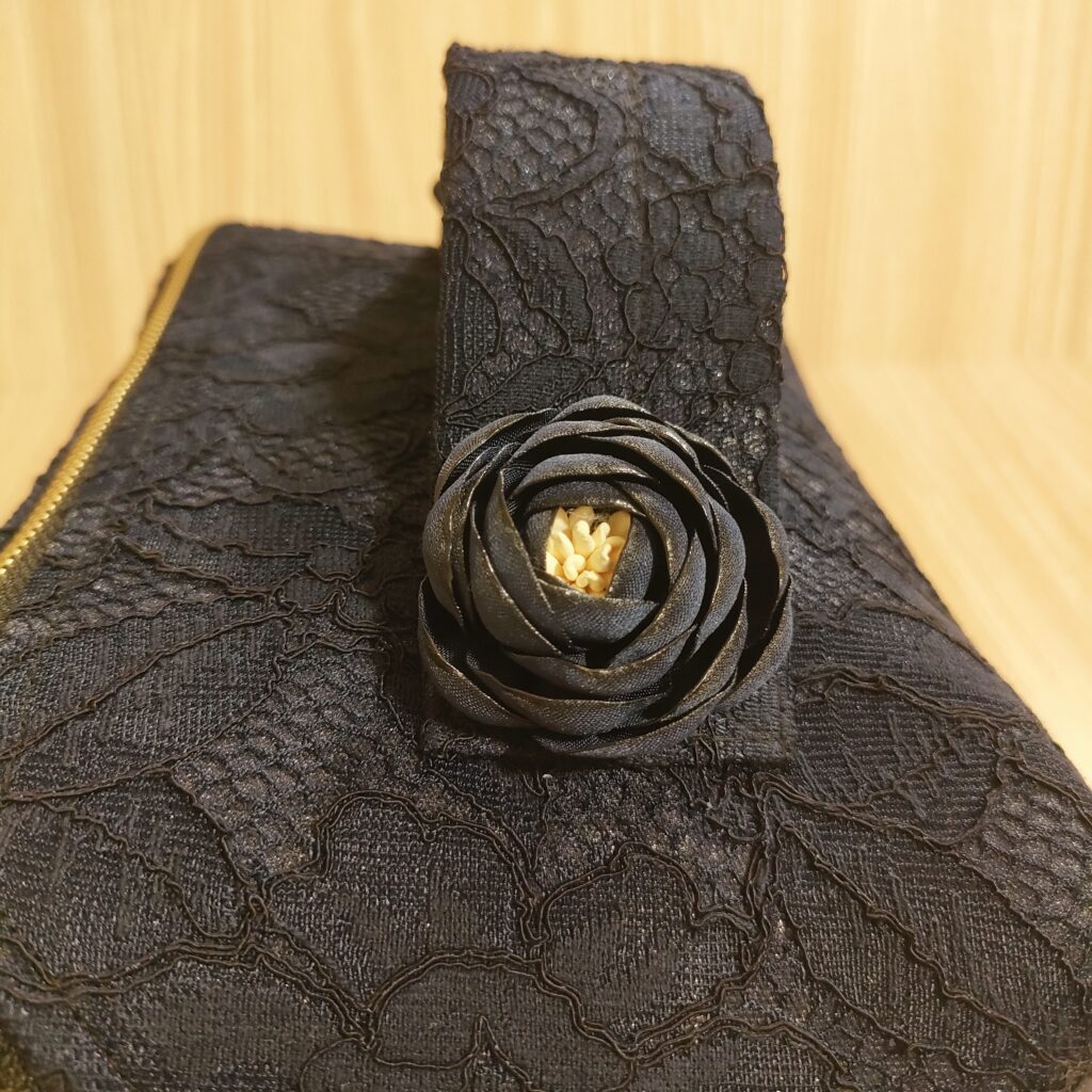 持ち手には同生地で仕立てた薔薇モチーフを2輪添え、