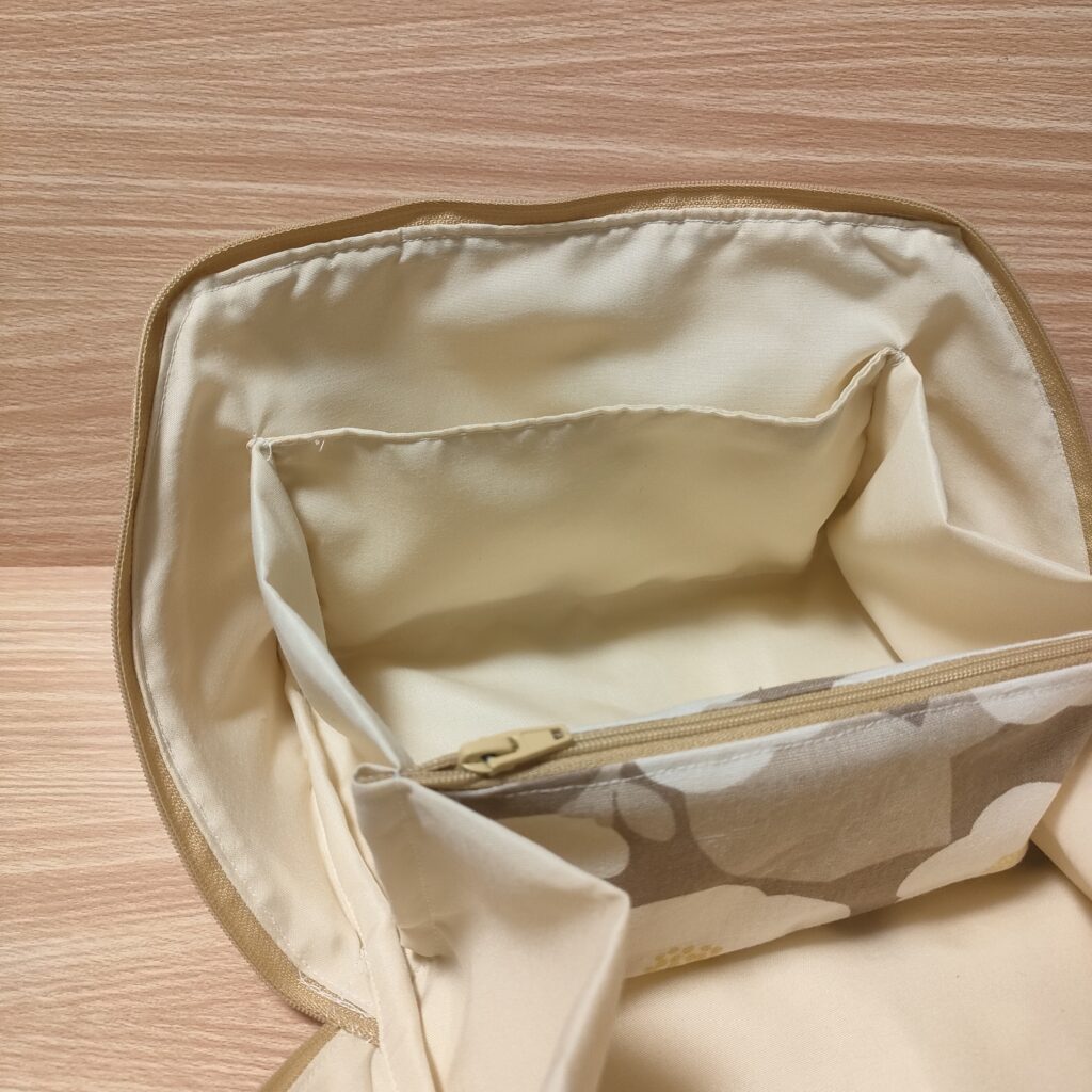 🔹 中央にはファスナー付きの仕切りポケットを配置。